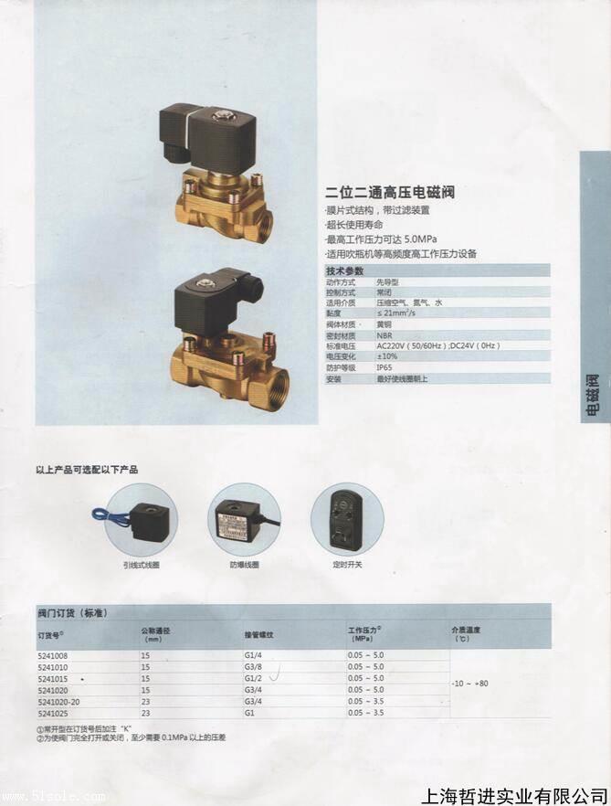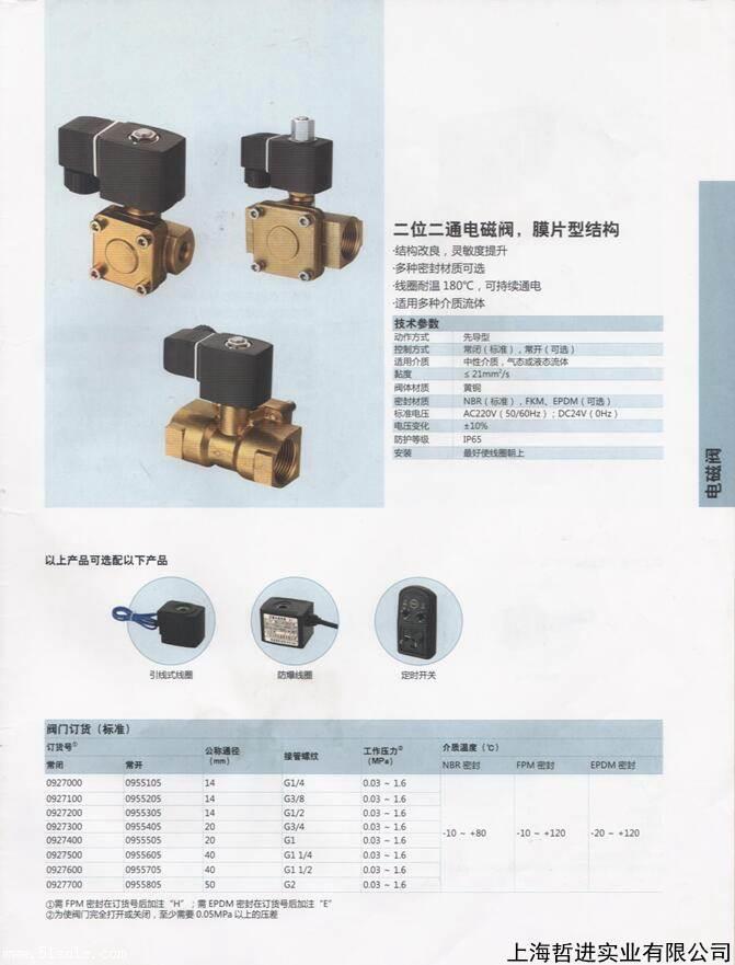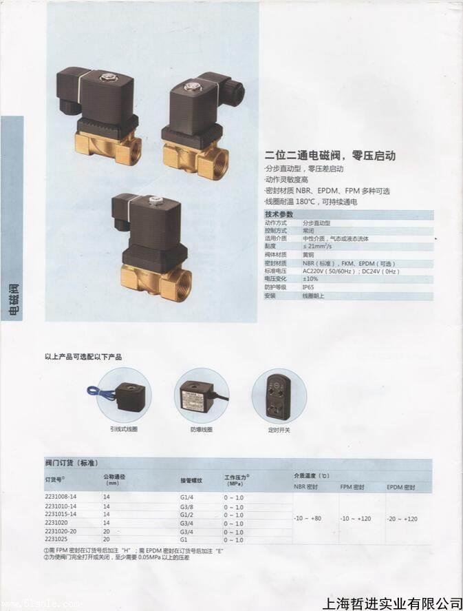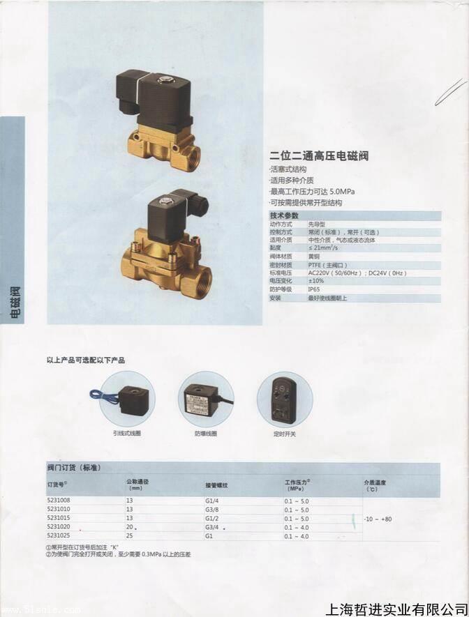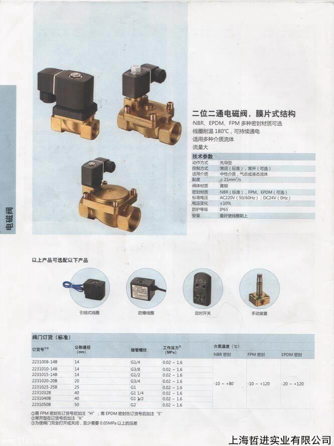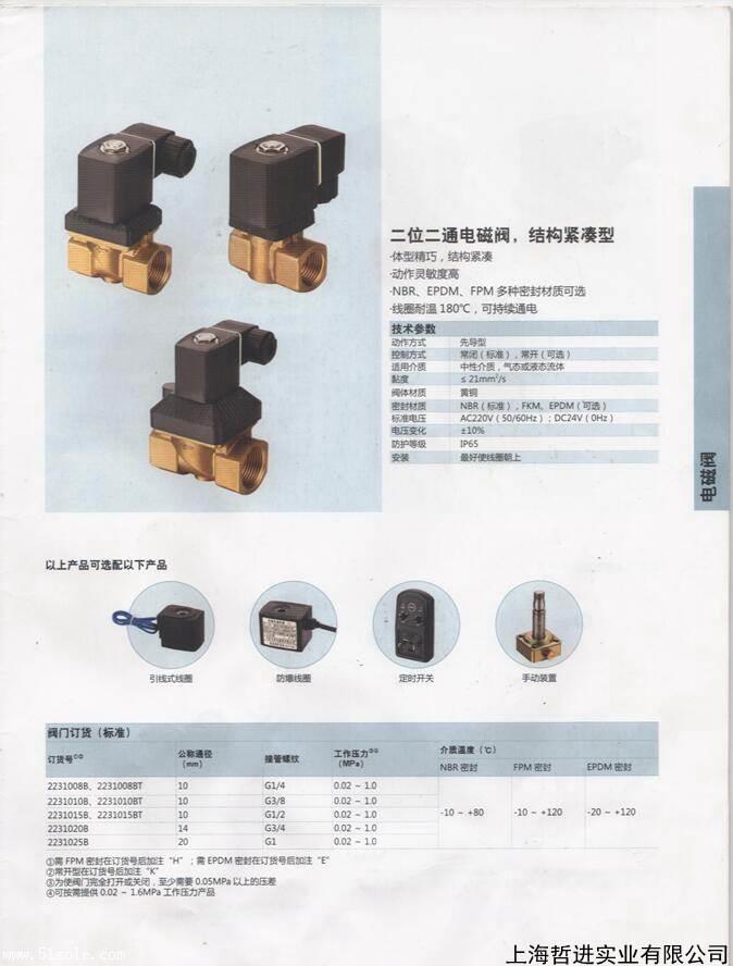 电磁阀是一种由电磁控制的工业装置。它是用以操纵流体的自动化基本组件。它属于执行器,不仅限于油压和气动,它在我们的日常生活中被普遍用到。首先,我们对电磁阀有初步的了解。电磁阀由电磁线圈和磁芯构成,是有着一个或多个孔的阀体,当线圈通电或断电时,磁芯的操作会导致流体流经阀体或被切断以实现变动流体方向的目的。更详尽的基准可以上海哲进实业有限公司